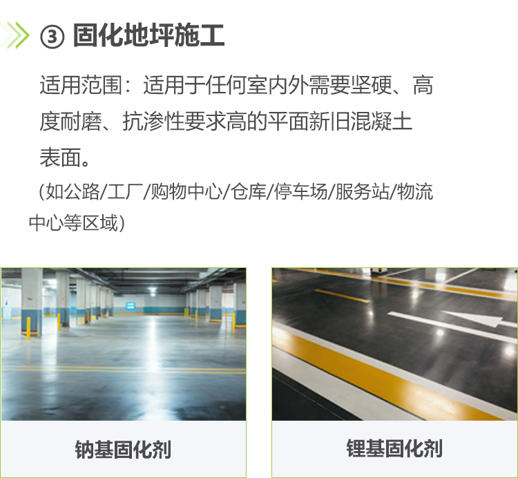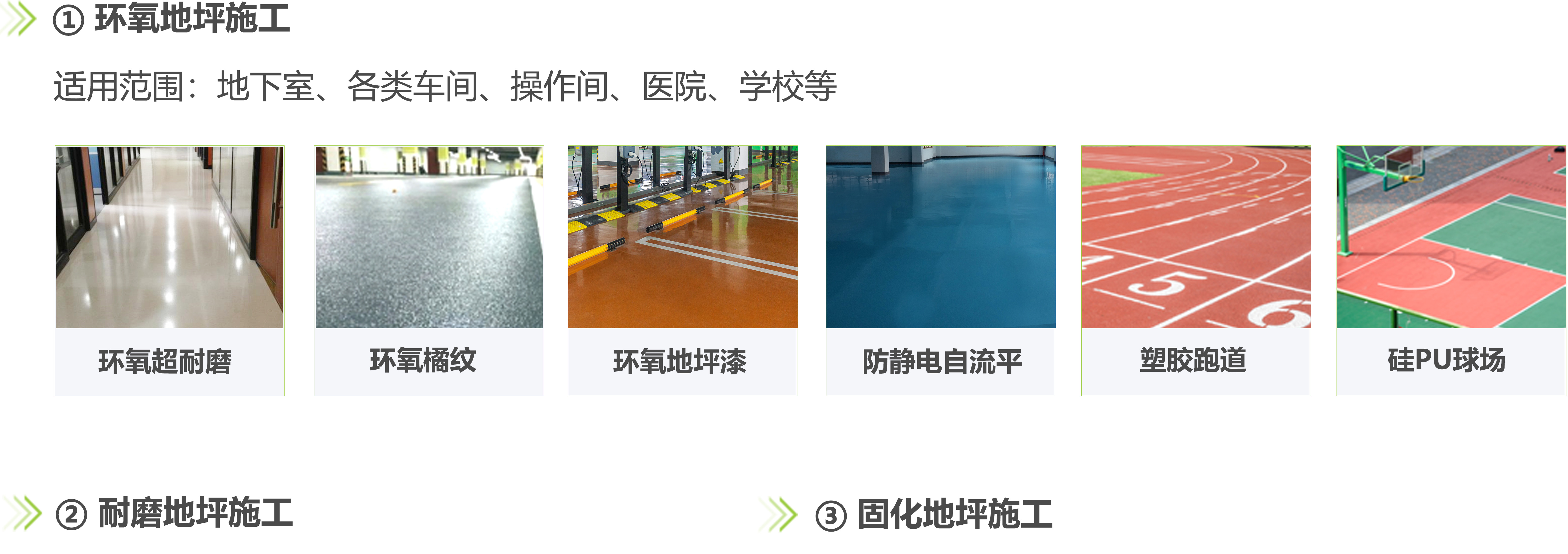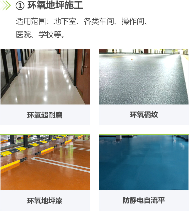 主要有滲透固化地坪及各類環(huán)氧地坪改造。(包含精鋼砂地坪、耐磨環(huán)氧地坪、環(huán)氧樹脂地坪系列、聚氨酯地坪系列、水泥自流平系列、丙烯酸地坪系列、運(yùn)動(dòng)場(chǎng)地坪、彩砂地坪、水泥固化地坪、硅PU球場(chǎng)、塑膠跑道等。)